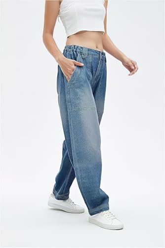 • Women's baggy denim jean. It's styled with a flattering high-rise waist, a straight leg silhouette, zip-fly and one-button closure, loose fit, 4 pockets. The relaxed fit is kept modest at the crotch and naturally tucked in at the ankle to create an elegant curve.