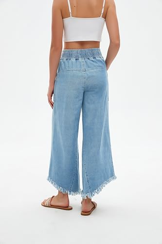 More information about Women's Cropped Wide Leg High Waisted Baggy Jeans Raw Hem Button Closure Denim Pants with Pockets