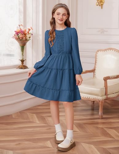 • Features: Girls fall dress with solid color features long lantern sleeves, loose tiered ruffled hem, lace trim at center chest, crew neck, A-Line, back keyhole, lined, combining trendy style with comfort. The unique design adds a touch of sophistication, perfect for young fashionistas
