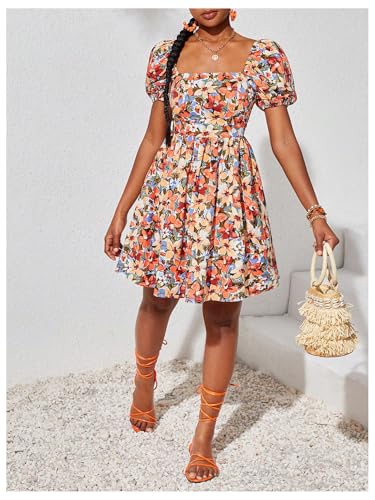 Floerns Girl's Floral Bow Backless Flowy Dress Square Neck Puff Sleeve Short Dresses 1