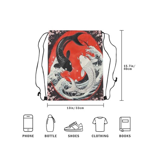 HOT ! Erosebridal Japanese Ukiyoe Koi Fish 13X15.7 Drawstring Bags Pink Cherry Blossom Drawstring Backpack Sea Wave Red Sun Draw String Back Bag Traditional Japanese Patterns Cinch Bag