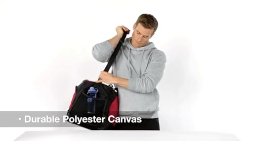 • Adjustable shoulder strap. Zippered end pocket with gusseted shoe, ball or equipment pocket
