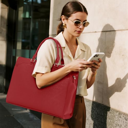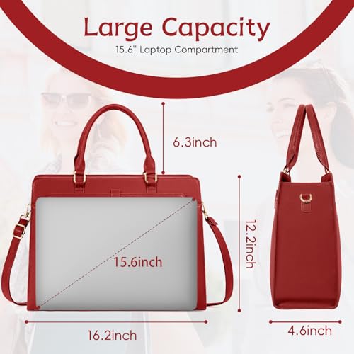 • 【LARGE CAPACITY & MULTI-POCKET DESIGN】This leather womens laptop bag features a spacious main compartment with a padded laptop sleeve (15.4" × 7.9") that securely fits and protects your MacBook or other 15.6-inch laptops. Includes 2 side slip pockets, 2 pen holders, 2 small accessory pockets, and 2 interior zipper pockets to keep your essentials organized. Dedicated side pockets and slots provide convenient storage for an umbrella, water bottle, pens, and other office supplies