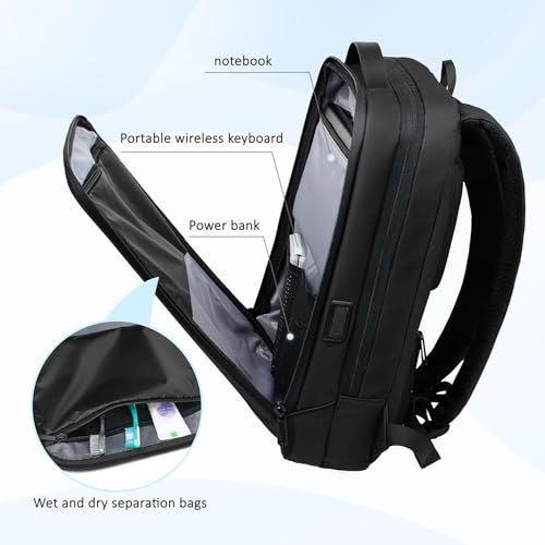 • Multi-compartment Backpack: The slim backpack owns many independent pockets for your items good organized. The front pocket can store passport, power bank or other small items,and a separate dry-wet compartment. One separate laptop compartment fits 15.6 inch Laptop as well as 15 inch, 14 inch and 13 inch Laptop.Hidden zipper pockets for additional anti theft protection on the back of the backpack.