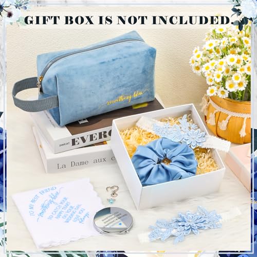 Hanaive Set of 6 Something Blue Wedding Gift for Bride Something Blue Cosmetic Bag Embroidered Handkerchief Bouquet Charm Diamond Compact Mirror Hair Scrunchie Knotted Garters for Bridal Shower party 5