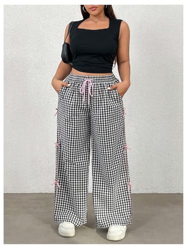 HOT ! Verdusa Women's Plus Size Gingham Plaid Bow Pants Drawstring High Waisted Wide Leg Loose Trousers