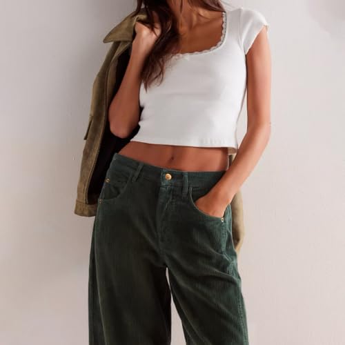 More information about Corduroy Pants for Women Barrel Pants Elastic Waist Mid Rise Cropped Pants Casual Baggy Pants with Pockets
