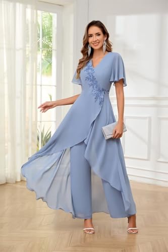 2 Pieces Mother of The Bride Pant Suits for Women V Neck Short Sleeve Chiffon Formal Wedding Outfits 5