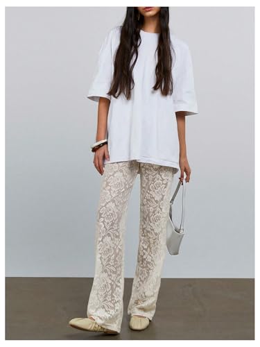 HOT ! Floerns Women's Floral Lace Straight Leg Pants See Through Going Out Rave Bottoms