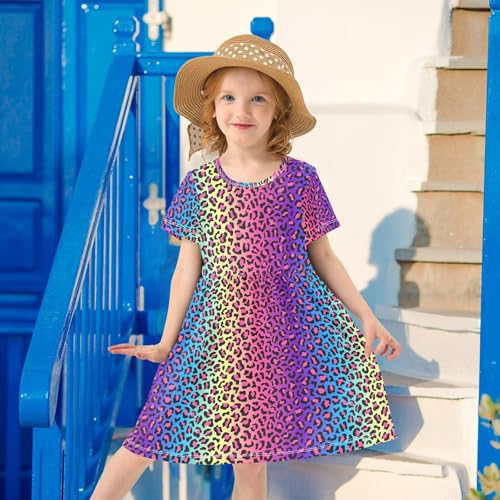 ALAZA Girls Summer Dress Short Sleeve Neon Rainbow Leopard Cheetah Casual Girls Dresses for Kids 2-8 Years 1