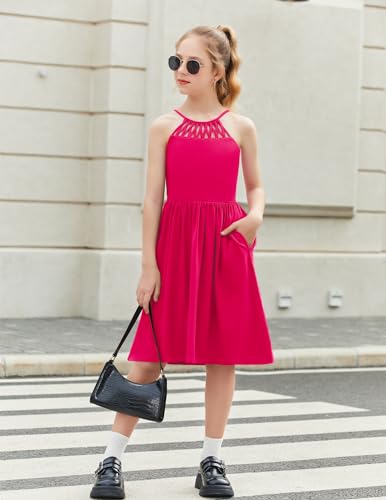 Arshiner Girls Summer Dress Halter Neck Boho Crochet Hollow Out Casual Sundress with Pockets for 5-13 Years 4