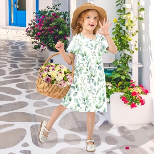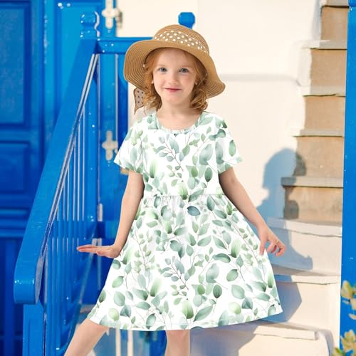 Emelivor Eucalyptus Green Leaves Watercolor Girls Dresses Short Sleeve Twirly Sundress 6
