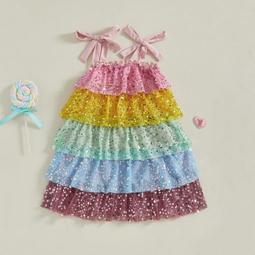 Kids Girls Dresses Tie up Sleeveless Sequins Contrast Color Layered Summer Dress Bowknot Strap A-line Sundress 6