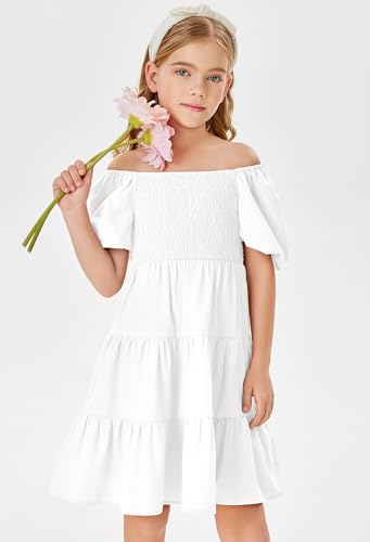 Batermoon Girls Boho Square Neck Puff Sleeve Off Shoulder Smocked Tiered Casual A Line Short Mini Dress 1