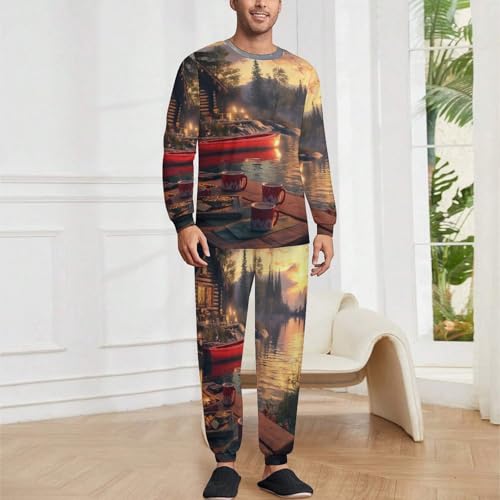 HOT ! Lake Cabin Boat Men’s Pajama Set Long Sleeve Top And Pants Loungewear Sleepwear Pjs Nightwear