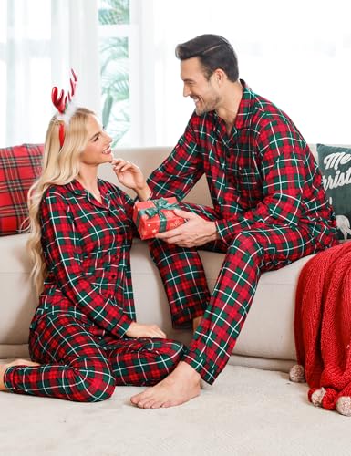 • BUTTON-DOWN PAJAMAS SETS: Classic matching Couples Xmas PJs consist of the convenient button-down long-sleeve top with a notched collar & chest pocket lending sophisticated detail; full-length pants fit perfectly with an elastic waist, keeping you comfy without being too tight
