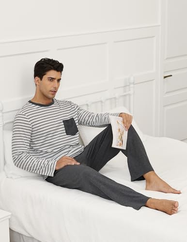 • Two piece loungewear pajama set: This pijamas para hombres includes a comfortable men's T-shirt and a stylish pair of pajama pants. The pajama top features a crew neckline and a classic stripe pattern. Contrast accents on the chest pocket and pants add an elegant touch, ensuring every man exudes sophistication and confidence, whether at home or entertaining guests