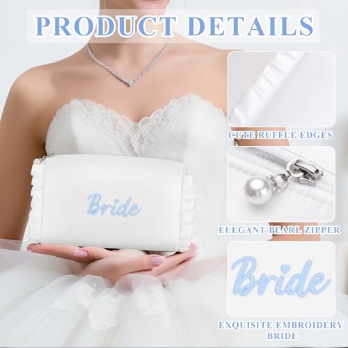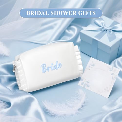 • Something Blue Gift For Bride: We hope you're ready to become the coolest bride around with our beautiful white satin bride cosmetic bag!Featuring a blue embroidered "bride" and ruffle edges, there's not a moment this bag isn't ready for!Don't miss the chic pearl zipper details