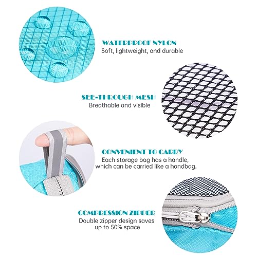 • ☑️【Premium Quality】All packing cubes are made from quality nylon and have a front mesh panel. Soft, lightweight nylon with high density and extensibility is waterproof and tear resistant. Mesh material is breathable and visible so that you can view your belongings inside without opening the cases. All packing cubes also include a quick grab function for easy access to the packed cubes from a suitcase or backpack. Smooth metal zippers make them extremely durable when filled with more essentials.