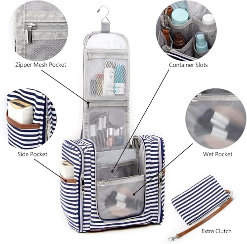 HOT ! Pearl Angeli Hanging Toiletry Bag for Women, Large Makeup Cosmetic Bag, Water Resistant Toiletries Travel Essentials Organizer, Full-size Container, Navy-striped