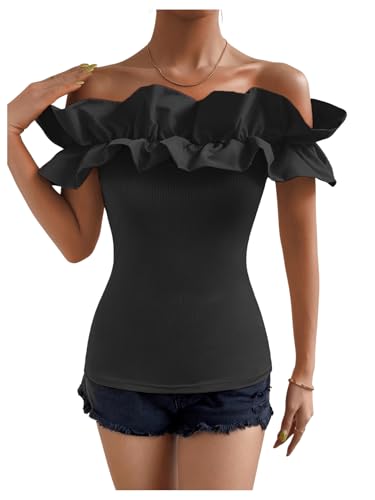 • Unique design:: short sleeve, rib knit, off shoulder, exaggerated ruffle trim, slim fit, women short sleeve casual fashion shirt is good to pair with variety of jeans, skirts, pant