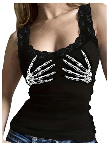 HOT ! SweatyRocks Women's Skeleton Print Goth Tank Tops Lace Sleeveless Slim Fit Rave Knit Tops