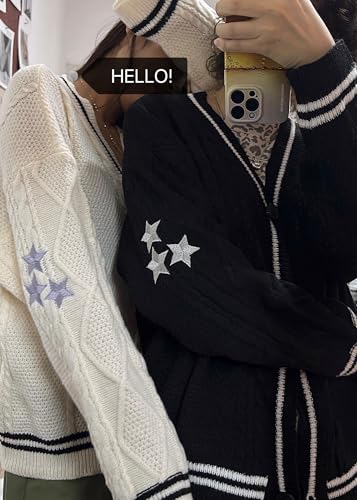 Women's Cardigan Star Embroidery Knit Open Front Cardigan V Neck Long Sleeve Oversized Button Sweater Coat Outwear 4