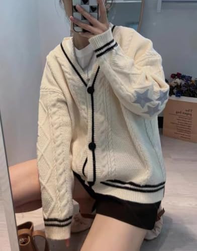 HOT ! Women's Cardigan Star Embroidery Knit Open Front Cardigan V Neck Long Sleeve Oversized Button Sweater Coat Outwear