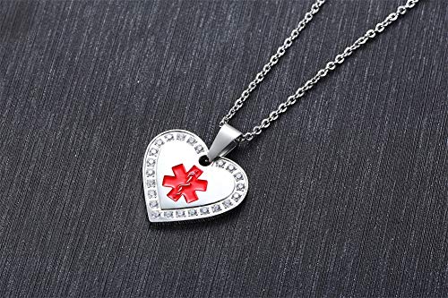 MEALGUET Personalized Custom Stainless Steel CNC Cubic Zirconia Heart Shape Medical Alert ID Pendant Necklace for Women with Chain 7