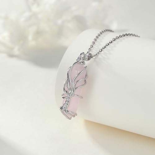 Healing Crystal Necklace for Women 925 Sterling Silver Tree of Life Rose Quartz Pendant Pink Crystal Necklace Jewelry Gifts for Women 5