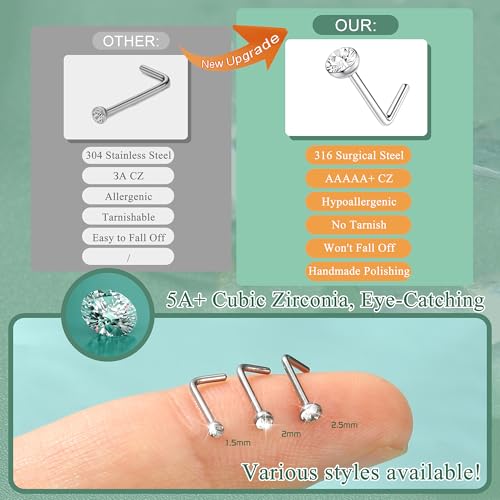 THUNARAZ Straight L Shaped Stainless Steel Nose Studs Rings Piercing Pin Body Jewelry 20G-22G 1.5mm 2mm 2.5mm 2