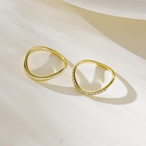 • MODERN STACKS - 2-Pack Gold Minimalist Rings -- cute and modern slim 2pairs V-shaped ring and wavy rings features a special and timeless minimalistic design, composed of a smooth plain ring and an AAAA zircon ring,which is both fashionable and classic. Its slim, lightweight, and sturdy build guarantees it always retains its shape, and its smooth surface ensures it will never scratch your hands or clothing. Its comfort fit allows you to wear it every day without any fuss.