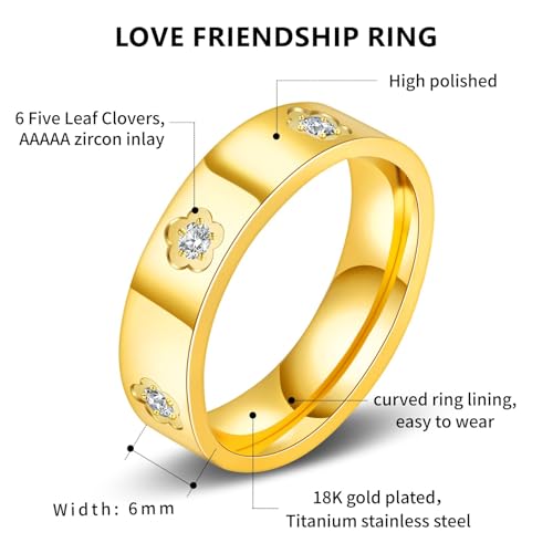 18k Gold Dainty Five Leaf Clover Inlaid Zircon Rings Love Friendship Gold Ring for Women Stainless Steel Wedding Band Promise Ring Jewelry Birthday Gifts for Women 6
