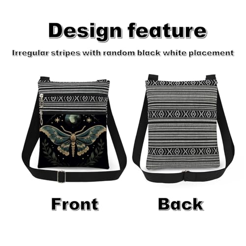 • ​​3. 【Design】​​The Moth crossbody bag uses heat transfer printing technology for fade-resistant patterns. The irregular black-and-white stripes are crafted with a woven process, and their placement varies randomly (positions may differ slightly due to hand-cutting). The dual-pocket design helps efficiently organize different items, while the adjustable strap accommodates most users.