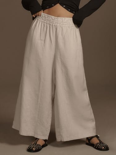 HOT ! Women's High Waist Wide Leg Linen Blend Pants, Relaxed Smocked Beach Trousers with Side Pockets, Fit for Casual Wear