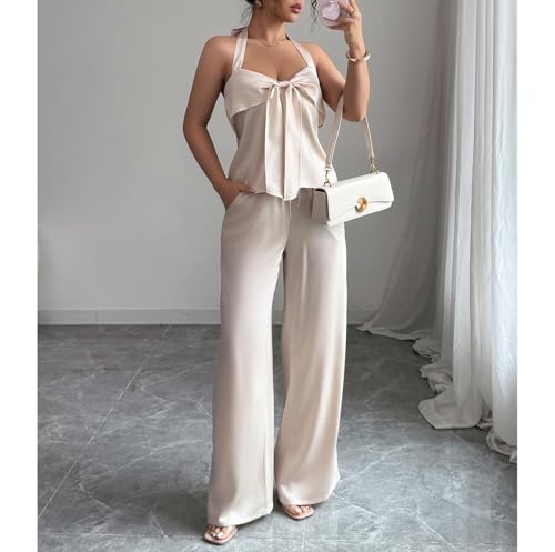 watersouprty Women's Sexy Two Piece Outfit Summer Sleeveless Halter Vest Wide Leg Pants Set 6