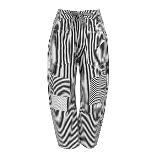 HOT ! Patchwork Striped Pants Women Baggy Horseshoe Tie Waist Jeans Trendy Barrel Jeans Vintage Wide Leg Denim Pants