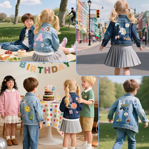 • Customized jean jacket for girls– Choose from over 60 adorable patterns to create a unique and surprising look for your child's custom jean jacket ! From butterflies, flowers, hearts, rainbows, and smiley faces to astronauts, crowns, flags, animals, and cars, each patch is unique and colorful, making it a favorite for your child. Choose up to eight patches and freely combine them to create your own unique look (maximum one large patch, and small patches and text can be mixed and matched)