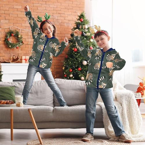 Lemur Cute Pattern on Green Toddler Fleece Jacket Girl Boys Hooded Fleece Jacket Coat Warm Outwear Zip-up 3-10T 4