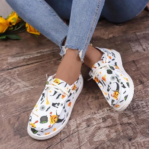 2025 Women Fashion Halloween Canvas Sneakers,Skeleton Pumpkin Printed Walking Shoes for Women,Casual Lace Up Low Top Comfortable Walking Canvas Sneakers Skeleton,Slip on Flats Pumpkin Shoes 6