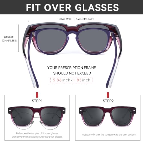 • Sunglasses Fit Over Glasses: These sunglasses are specially designed for those who wear prescription glasses, and easily wear over regular glasses. (frame length within 5.86 inches & frame height within 1.85 inches).