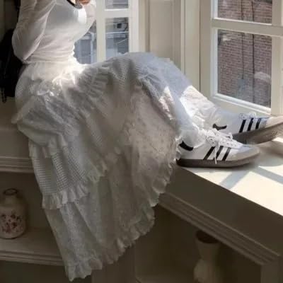 HOT ! Women's Y2K Boho Ruffle Lace White Maxi Skirt Tiered Long Skirt Elastic High Waist Pleated A-Line Long Skirt
