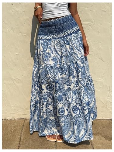 HOT ! GORGLITTER Women's Boho Graphic Flowy Maxi Skirt High Waisted Tiered Ruffle Smocked A Line Beach Skirts