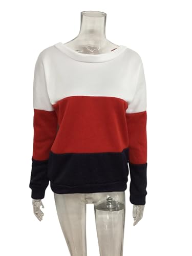 Winter new casual contrasting color patchwork hoodie round neck long sleeved loose pullover top(Lake Blue,S) 1
