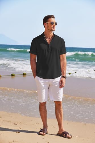 HOT ! COOFANDY Men's Linen Henley Shirt Short Sleeve Casual Summer Beach Hippie T Shirts