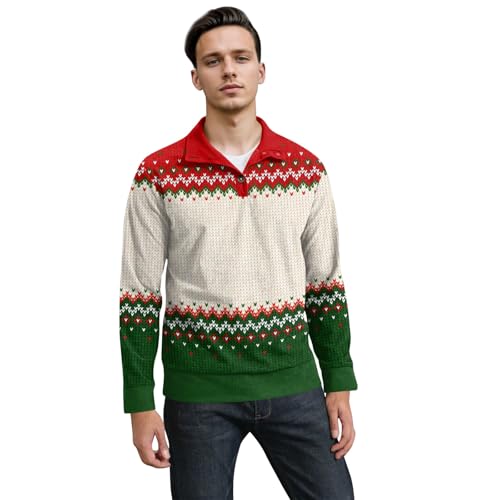 Ugly Christmas Sweater Men Corduroy Long Sleeve Stand Collar 1/4 Button Up Thermal Sweatshirt 1