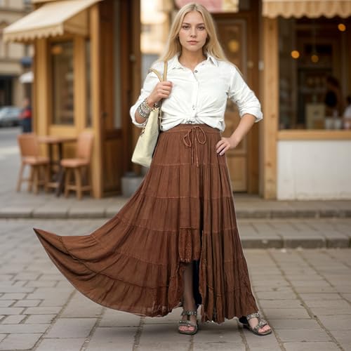 HOT ! Agan Traders Women's 2025 Spring Peasant Tiered A Line Flared High Low Elastic Waistband Flowy Long Maxi Skirt
