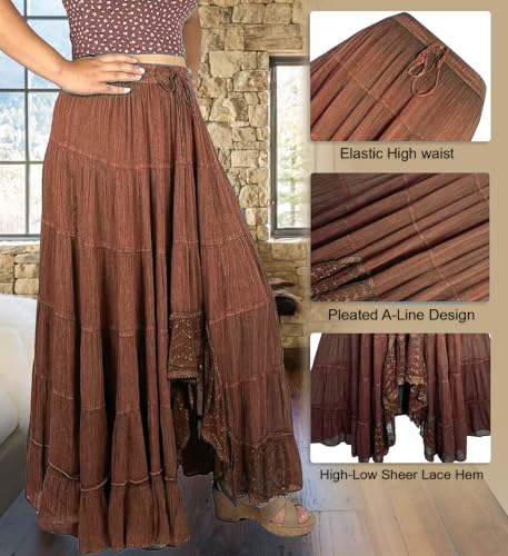 Agan Traders Women's 2025 Spring Peasant Tiered A Line Flared High Low Elastic Waistband Flowy Long Maxi Skirt 6
