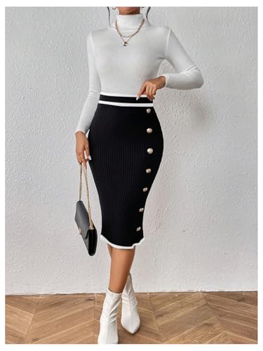• Features: Ribbed knit, contrast binding, midi length, button, bodycon, skirt for women