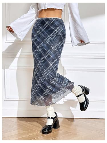 HOT ! Floerns Women's Plaid Mesh Fishtail Skirt High Waist Lettuce Trim Summer Midi Skirts